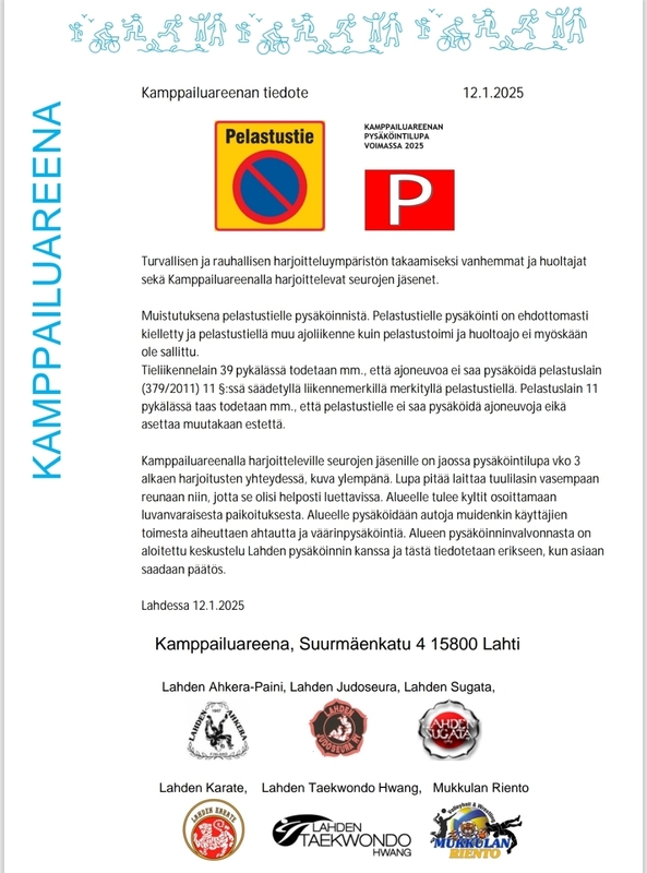 Muistutuksena pelastustielle pysäköinnistä. Pelastustielle pysäköinti on edelleen ehdottomasti kielletty ja pelastustiellä muu ajoliikenne kuin pelastustoimi ja huoltoajo ei myöskään ole sallittua. Kamppailuareenalla harjoitteleville seurojen jäsenille on jaossa pysäköintilupia vko 3 alkaen harjoitusten yhteydessä. Lupa pitää laittaa tuulilasin vasempaan reunaan niin, jotta se olisi helposti luettavissa. Alueelle tulee kyltit osoittamaan luvanvaraisesta paikoituksesta. Alueelle pysäköidään autoja muidenkin käyttäjien toimesta aiheuttaen ahtautta ja väärinpysäköintiä.