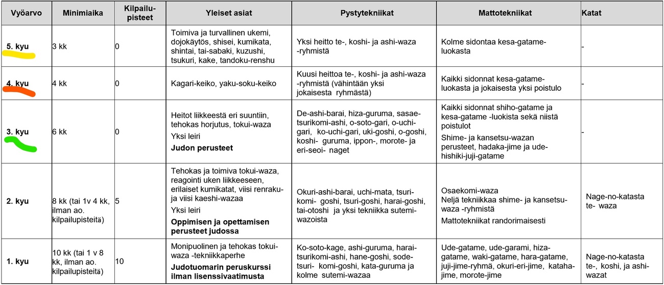 Lahden Judoseuran syyskauden vyökoe järjestetään Kamppailuareenalla lauantaina 16.12.2017 klo 10:00-12:00. Joulukuun vyökokeeseen voivat osallistua seuran jäsenet, jotka tulevat suorittamaan keltaista, oranssia, vihreää, sinistä tai ruskeaa vyötä. Oranssista ylöspäin vyökoemaksu on 28 euroa ja se maksetaan ilmoittautumisen yhteydessä. Vyökoemaksu ei sisällä uutta vyötä, vaan se tulee hankkia itse. Ilmoittautuminen oranssin, vihreän, sinisen ja ruskean vyön kokeeseen tapahtuu täällä: https://www.suomisport.fi/events/26164552-b79f-43d9-8126-723a17201480 Kirjoita ilmoittautumisen Lisätiedot-kohtaan tieto siitä, mitä vyötä olet tulossa suorittamaan. Vyökokeeseen hyväksytyt julkaistaan seuran nettisivuilla ja Facebookissa sunnuntaihin 10.12..2017 mennessä. Aikuisten peruskurssi suorittaa keltaisen vyön, mutta ilmoittautuu vyökokeeseen suoraan ohjaajalle, Hannalle. Vyökoemaksu ja vyö kuuluu kursiin hintaan. Lasten peruskurssi suorittaa keltaisen vyön toukokuussa. Vyökoetilaisuus alkaa klo 10. Kamppailuareenan ovet avataan klo 9:30. Tule ajoissa paikalle. Vyökokeeseen tullaan puhdas valkoinen judopuku päällä. Judopassi on oltava mukana. Voimassaolevat graduointisäännöt löytyvät täältä: https://www.judoliitto.fi/site/assets/files/7049/graduointisaannot_05072017_master.pdf ja tämän uutisen yhteydessä kuvana tiivistelmätaulukko ja tekstin lopussa tietoa vähimmäisvaatimuksista. Jos kysyttävää, kysy lisää omalta ohjaajaltasi tai Sannalta sanna.pyykonen@gmail.com, puh. 0407054221. Keltainen vyö: Yksi käsi-, lonkka- ja jalkaheitto, kolme sidontaa kesa-gatame-luokasta (sidonnat löytyvät graduointisääntöjen sivulta 8, kohdasta Katame-waza, siellä lista osaekomi-waza) Oranssi vyö: Kuusi heittoa (käsi-, jalka- ja lonkkaheittoja, vähintään yksi kustakin luokasta), kaikki sidonnat kesa-gatame-luokasta ja jokaisesta yksi poistulo. (sidonnat löytyvät graduointisääntöjen sivulta 8, kohdasta Katame-waza, siellä lista osaekomi-waza) Vihreä vyö: Yksi leiri ja Judon Perusteet -kurssi (näistä tulee löytyä passista merkintä), Heitot: De-ashi-barai, hiza-guruma, sasae- tsurikomi-ashi, o-soto-gari, o-uchigari, ko-uchi-gari, uki-goshi, o-goshi, koshi- guruma, ippon-, morote- ja eri-seoi- naget, Mattotekniikat: Kaikki sidonnat shiho-gatame ja kesa-gatame -luokista sekä niistä poistulot Shime- ja kansetsu-wazan perusteet, hadaka-jime ja ude- hishiki-juji-gatame. Sininen vyö: Yksi leiri ja Oppimisen ja opettamisen perusteet judossa -kurssi (näistä tulee löytyä merkintä passista), viisi renraku- ja viisi kaeshi-wazaa, Heitot: Okuri-ashi-barai, uchi-mata, tsurikomi- goshi, tsuri-goshi, harai-goshi, tai-otoshi ja yksi tekniikka sutemiwazoista, Mattotekniikat: Osaekomi-waza Neljä tekniikkaa shime- ja kansetsu- waza -ryhmistä Mattotekniikat randorimaisesti sekä Nage-no-katasta te-waza. |